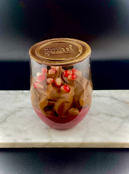 Pomegranate cream, chocolate cake, dark chocolate cremeux, fresh pomegranate seeds.